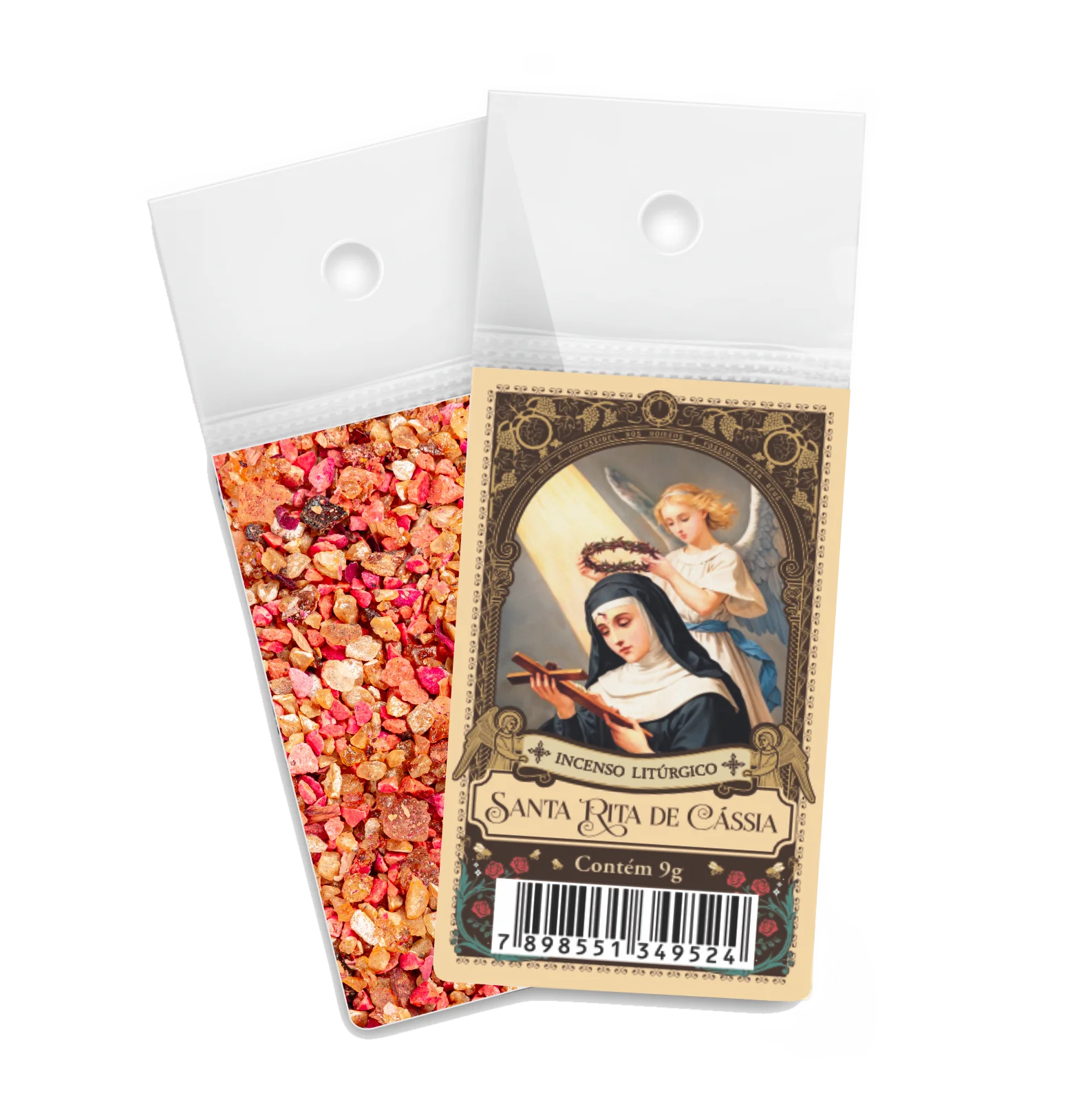 Saquinho contendo 9g de incenso Santa Rita de Cássia.